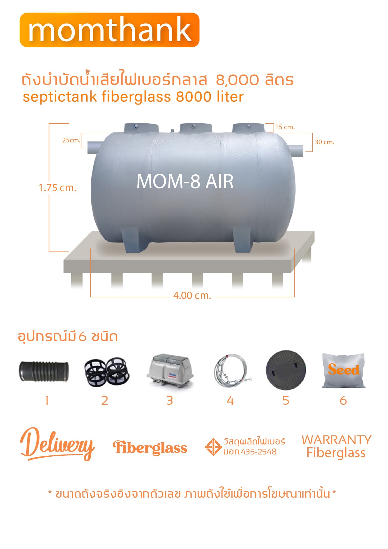 ถังบำบัดน้ำเสีย ขนาด 8000 ลิตร ชนิดเติมอากาศ วัสดุไฟเบอร์กลาส เลขที่ มอก.435-2548 ทรงแคปซูล ความกว้าง 1.60 m ความยาว 4.00 m. ความสูง 1.75 m. ภายในออกแบบเป็น ระบบเกรอะ ระบบเติมอากาศ ระบบตกตะกอน รับน้ำเสียจากน้ำอาบและขับถ่าย มีของแถมอุปกรณ์ เครื่องเติมอากาศ ลวดสลิง ฝาปิด ข้อต่ออ่อน หัวเชื้อจุลินทรีย์ มีเดีย