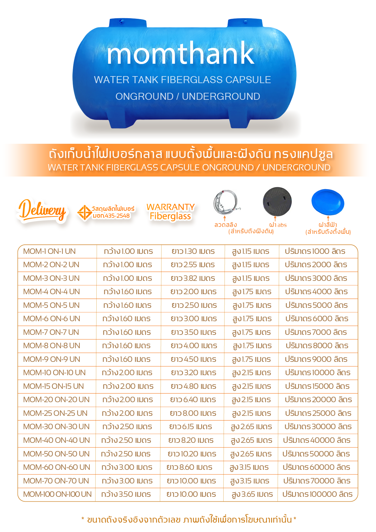 - ถังรุ่นนี้ออกแบบ เป็นทรงนอนกับพื้น เพราะทำจาก วัสดุไฟเบอร์กลาส ใช้เวลาในการสั่งผลิต 7-15 วัน ระยะเวลาขึ้นอยู่กับ ออเดอร์ในขณะนั้น